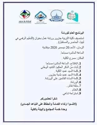 تمت بعون الله تعالى اليوم ورشة العمل بعنوان التعليم الرقمي في ليبيا حيث بدأت بأيات من القرآن الكريم والنشيد الوطني ومن ثم كلمة العميد وكلمة الأخ المسئول عن إدارة الورشة ومناقشة محاور الورشة واختتمت الورشة ومن ثم دعي الحاضرين لتناول الطعام ه