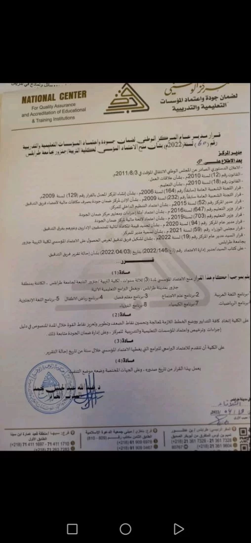 الحصول على الاعتماد المؤسسي لكلية التربية بجنزور
