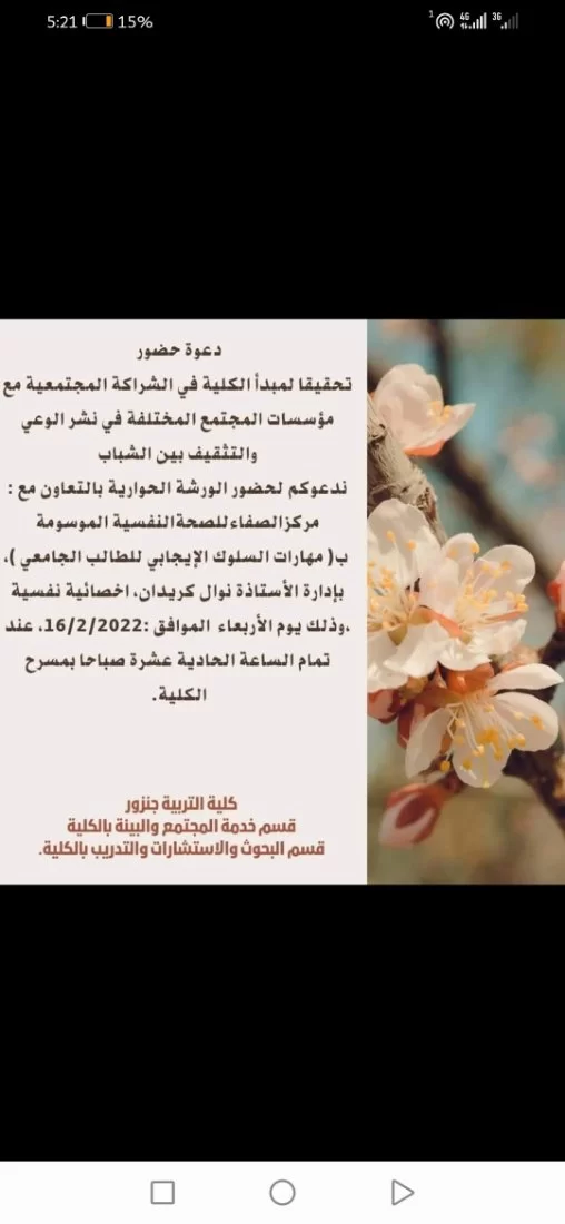 سيقام يوم الغد الأربعاء الموافق 16/2/2022 ورشة بعنوان السلوك الإيجابي للطالب الجامعي تلقيها