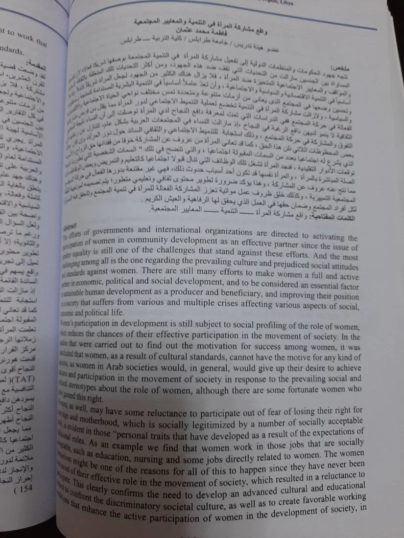 انطلقت صباح يوم الثلاثاء بطرابلس، فعاليات مؤتمر المرأة الليبية للدراسات الحديثة 2021، برعاية حكومة الوحدة الوطنية، واشراف وزارة الدولة لشؤون المرأة، وحضور وزيرة الدولة”حورية الطرمال”، أعضاء هيئات التدريس في الجامعات والمعاهد العليا، البحاث وطُلاب الدراسات العليا، عدد من ممثلي منظمات وهيئات المجتمع المدني، المهتمين بشؤون المرأة، صُناع القرار.يهدف المؤتمر بالعمل على حث كل المؤسسات لتعزيز مشاركة المرأة فيها، أيضاً إبراز دور البحث العلمي وأهميته لتمكين المرأة، والدفع لبناء استراتيجية وطنية لها، ووضع خطط علمية لمواجهة قضاياها.تضمنت أجندة المؤتمر مجموعة محاور حول (المرأة في القانون الليبي، المرأة الليبيةوالاقتصاد، المرأة والأزمات والكوارث، المرأة والإعلام، المرأة والعمل الخيري، المؤسسات وحقوق المرأة، المرأة والطب، المرأة ذوي الاحتياجات الخاصة، المرأة وتحقيق التنمية المستدامة، وعديد العناوين الاخرى.وقد شاركت الاستاذة فاطمة محمد عثمان بورقة بحثية بعنوان واقع مشاركة المراة الليبية في التنمية و معايير المجتمعية