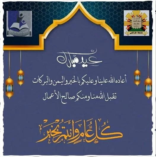 تتقدم إدارة كلية التربية/ طرابلس لكل الكوادر التدريسية والوظيفية وطلبة الكلية وللشعب الليبي عامة والأمة الإسلامية كافة؛ بأصدق التهاني وأطيب التبريڪات بمناسبة حلول عيد الفطر المبارك، سائلين المولى العلي القدير أن يجعل أيامڪم ڪلها أفراح وأن يُعيده علينا وعليڪم أعواماً عديدة وأزمنة مديدة وأنتم في أحسن