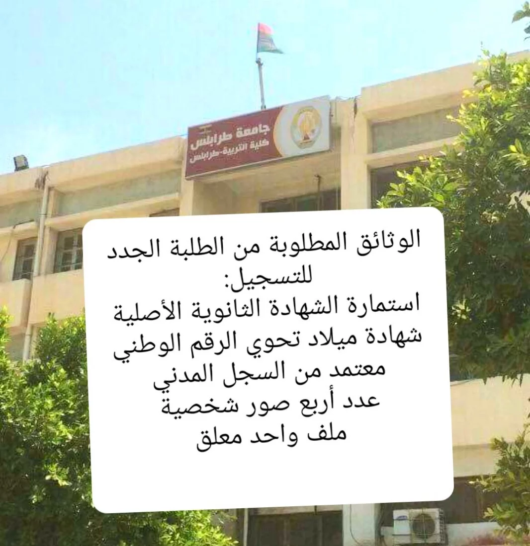 شرعت كلية التربية\ طرابلس من بداية مطلع الأسبوع الماضي في فتح أبوابها أمام الطلاب من حملة الشهادة الثانوية العامة للعام الماضي، وذلك للإلتحاق والتسجيل بالفصل الدراسي (خريف 2020- 2021 ) مصحوبين بالوثائق التالية: