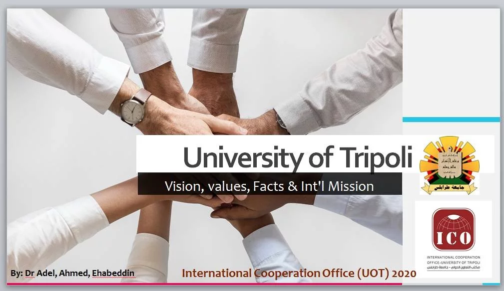 وفق مذكرة التفاهم التي تم اعتمادها من قبل السيد د. رئيس الجامعة وفي أطار وضع بنودها موضع التنفيذ ,عقد صباح اليوم اجتماع تشاوري (عبر الانترنت) ضم كل من ممثلين عن مكتب التعاون الدولي ومركز البحوث والاستشارات والتدريب بجامعة طرابلس و من الطرف التركي مديرة مكتب التعاون الدولي بجامعة إسطنبول أيدن وفريق عملها كذلك مدير مركز الدراسات الافريقية بالجامعة.وقد تم تقديم عرضين مرئيين يقدمان لمحة عن جامعة طرابلس وأفاق التعاون الدولي بها وكذلك عرض أخر عن مركز البحوث والاستشارات بالجامعة تناول أهم اهدافه لدعم الفرق البحثية وتطوير البحث العلمي والتدريب بالجامعة.وقد ناقش المجتمعون وضع اطار تنفيذي لبرامج تعاون مشترك فيما بين الجامعتين والتي من ضمنها على سبيل المثال اطلاق حزمة برامج علمية مشتركة تختص بالتدريب والبحث العلمي فيما يعود بالنفع للطرفين.