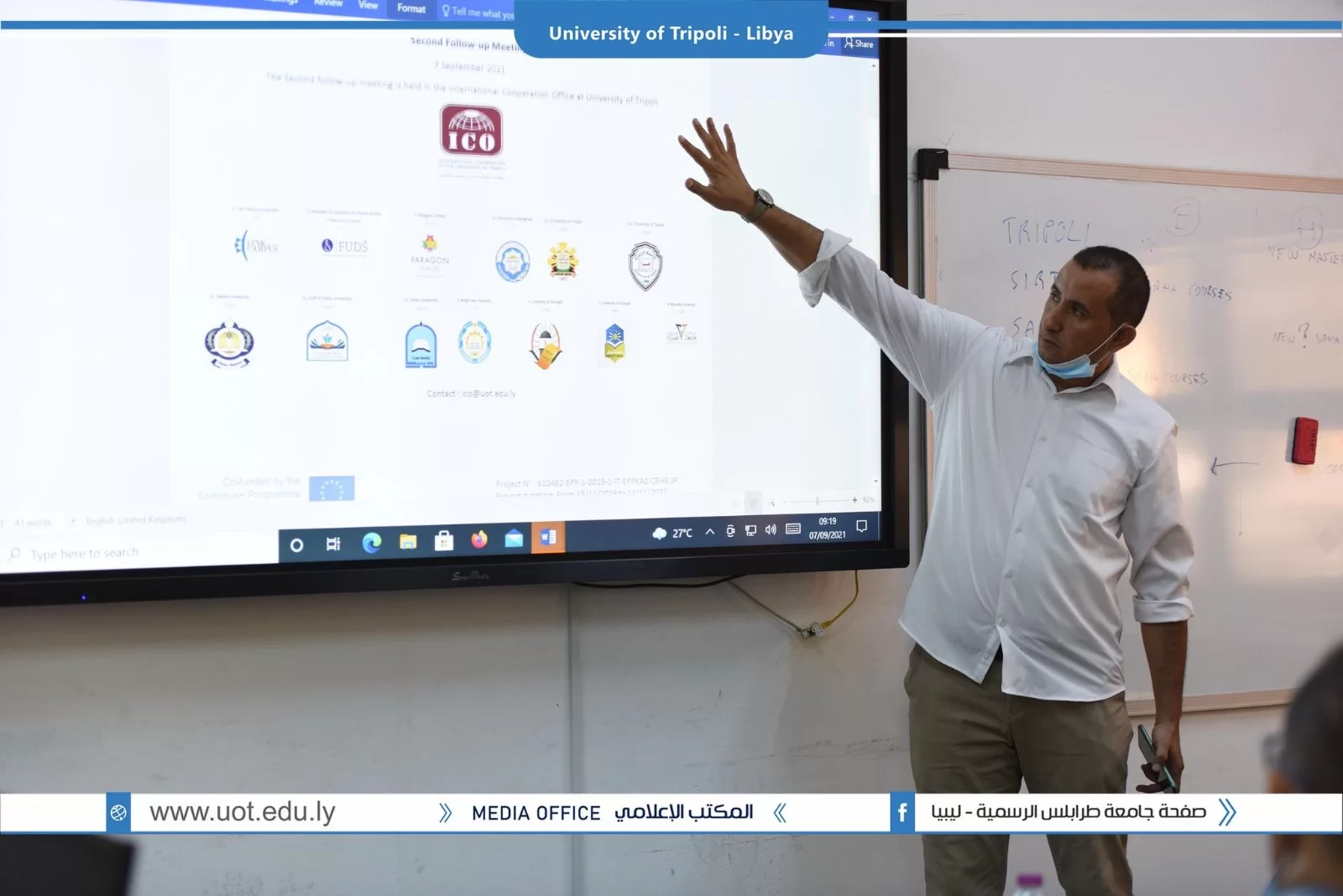 طرابلس 7 سبتمبر 2021م.عقد صباح اليوم الثلاثاء بقاعة التواصل بمكتب التعاون الدولي بجامعة طرابلس الاجتماع الدوري لمتابعة مشروع Libya Up وهو أحد مشاريع رفع قدرات مؤسسات التعليم العالي والممول من مفوضية الاتحاد الأوروبي والذي يقع تحض مظلة Erasmus+. وقد حضر الاجتماع كل من مدير مركز البحوث والاستشارات والتدريب ومدير مكتب التعاون الدولي، وكان من ضمن الحضور فريق عمل المشروع بالجامعة. الجدير بالذكر أن جامعة طرابلس شريك أساسي بالمشروع رفقة مجموعة من الجامعات الأوروبية والوطنية. ويدار المشروع بواسطة Link Compus University الإيطالية.