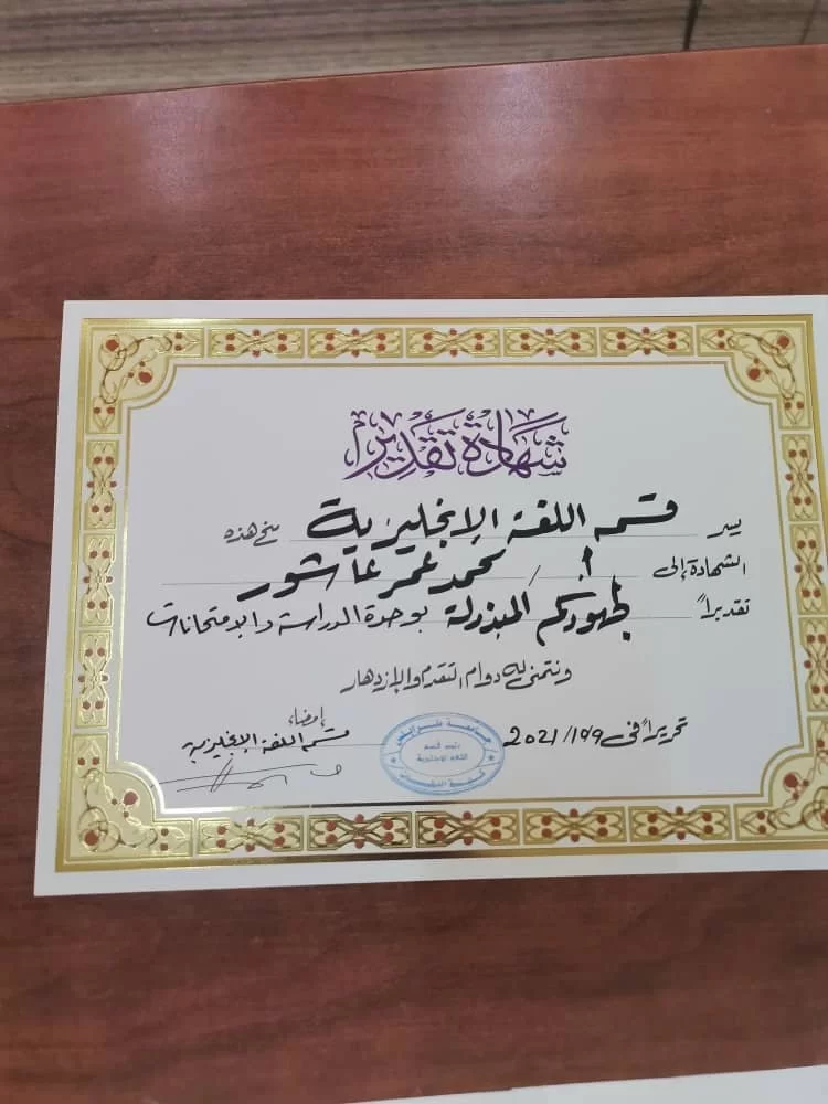 السبت 9 اكتوبر 2021 - في لفتة تقديرية متميزة وفريدة، قام رئيس قسم اللغة الإنجليزية بكلية اللغات الدكتور/حمزة الثلب رفقة الأستاد محمد عاشور رئيس وحدة الدراسة والامتحانات بالقسم بتكريم لفيف من أعضاء هيئة التدريس اللذين كانت لهم بصمة فاعلة وجهود مثمرة في سبيل جعل العملية التعليمية في القسم تسير على مسار التقدم والتطوير، متحديّن في ذلك كل العراقيل والصعوبات التي كانت تشكل تحدياً كبيراً للجميع، بدءاً بالحرب التي اجتاحت المنطقة ومروراً بجائحة كورونا وانتهاءً بالإعتصامات الإستحقاقية لأعضاء هيئة التدريس في التعليم العالي.
