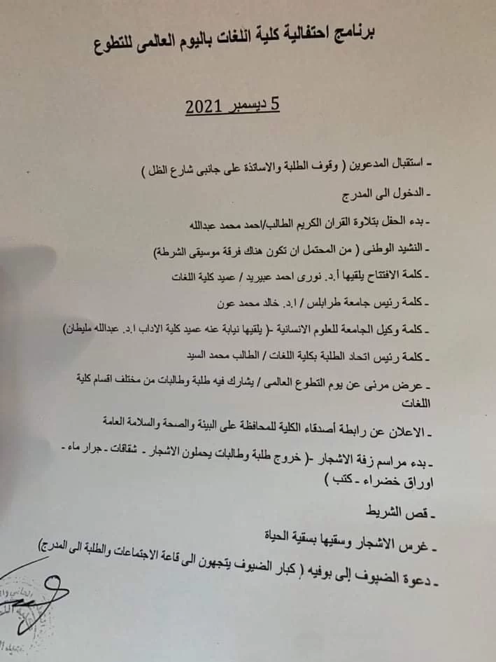 في سابقة إستثنائية فريدة من نوعها شهدت تكاثف وتعاضد غير مسبوق لكافة الموارد البشرية بكلية اللغات إبتداءً بعمادة الكلية وإداراتها وأقسامها مروراً بأعضاء هيئة التدريس فيها ووصولاً إلي طلابها وإتحادها الطلابي المتميز، أحيت كلية اللغات اليوم الأحد الموافق 5/12/2021 فعالية اليوم العالمي للتطوع، حيث شملت الفعالية حملة تشجير وتعشيب المسطحات الخضراء بالكلية وإظهارها بصورة جمالية تعكس روح النماء والتطور التي يتمتع بها طلبة الكلية وكل العاملين بها.