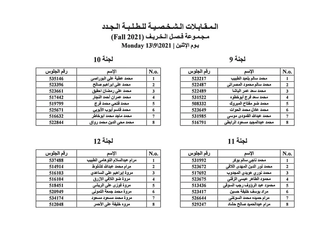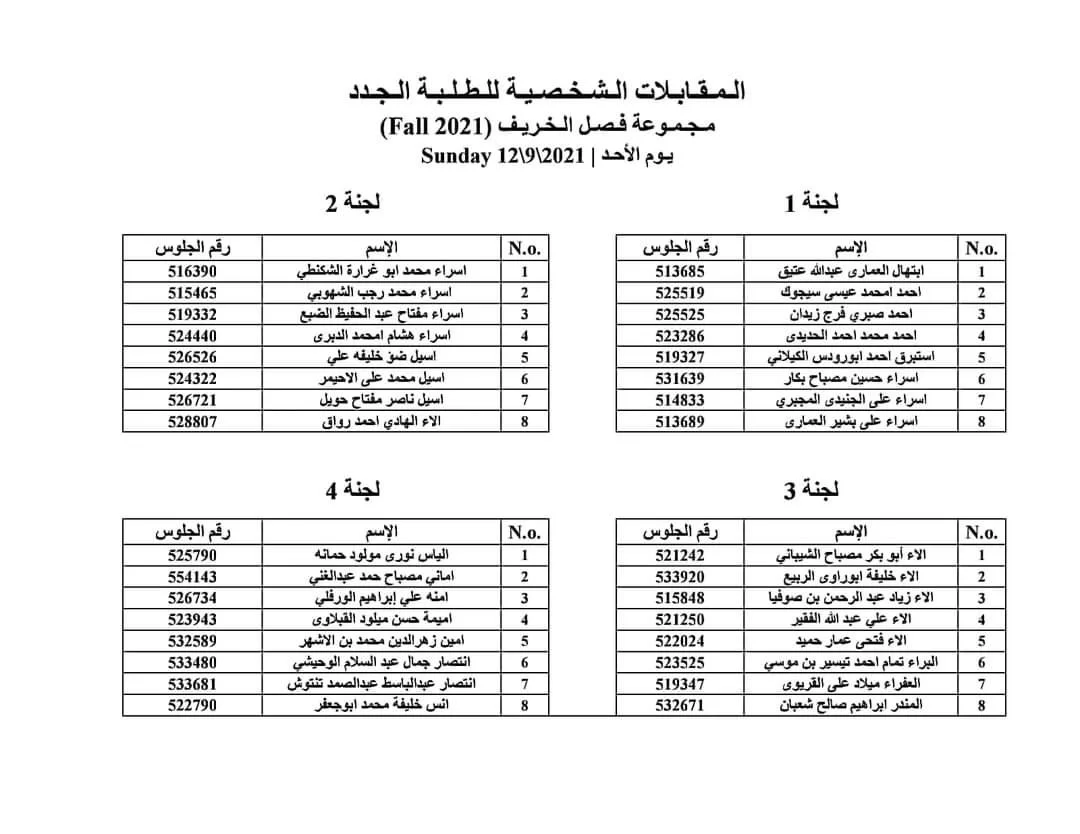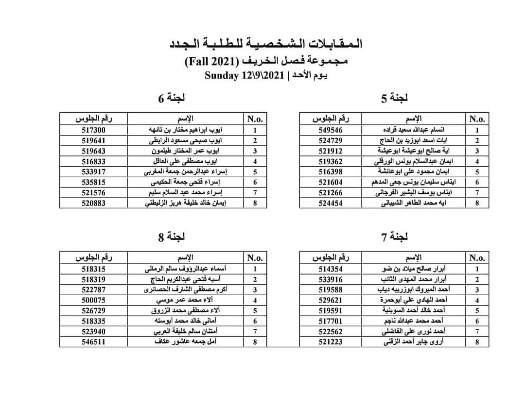 قوائم المقابلة الشخصية للطلبة الجدد فصل خريف 2021