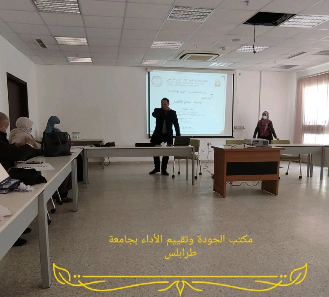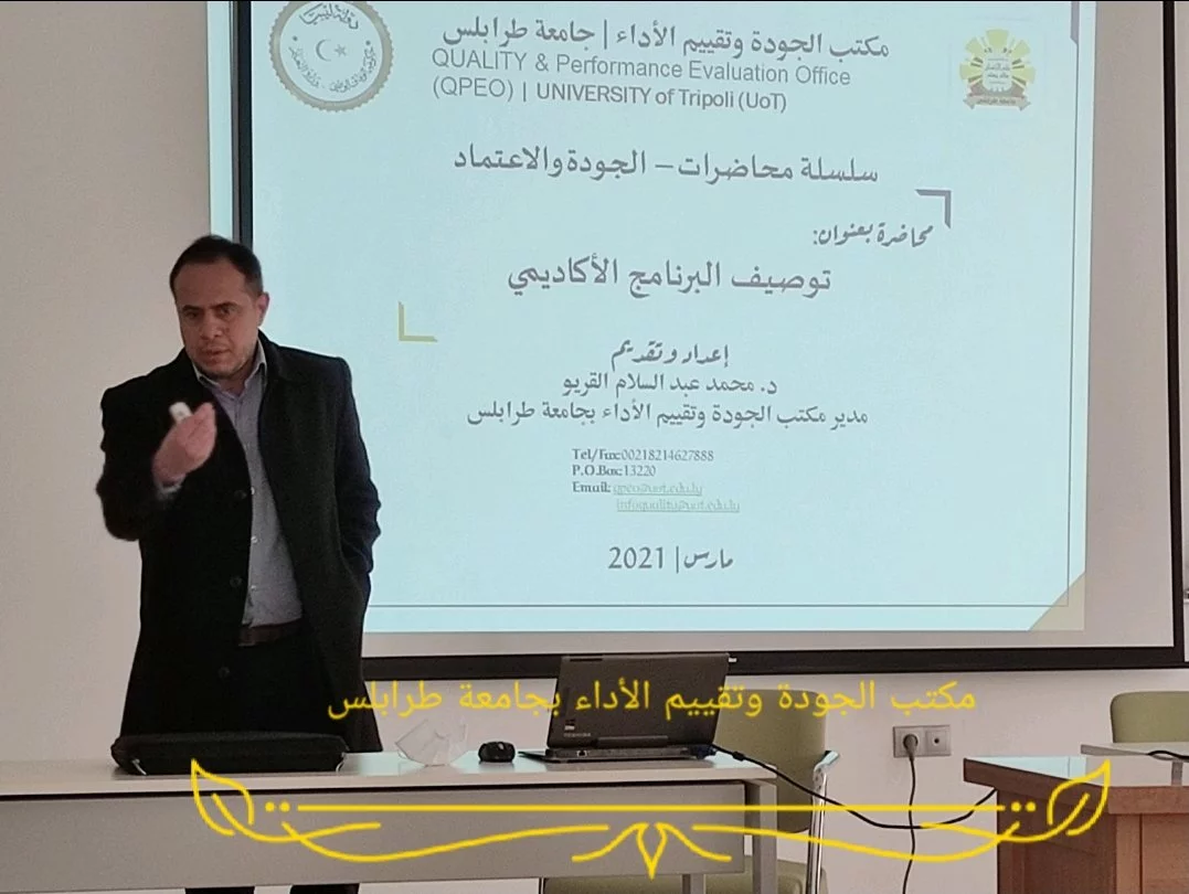 عُقدت يوم الأربعاء الموافق 17 مارس 2021م ورشة عمل بكلية الطب البشري بعنوان " المتطلبات البرنامج الأكاديمي: المفاهيم وآليات التطبيق" بالتنسيق بين مكتب الجودة وتقييم الأداء بجامعة طرابلس ومكتب الدراسات العليا والتدريب بكلية الطب البشري. وقام بإعداد وتنفيذ هذه الورشة "د. محمد عبدالسلام القريو" مدير مكتب الجودة وتقييم الأداء بجامعة طرابلس.