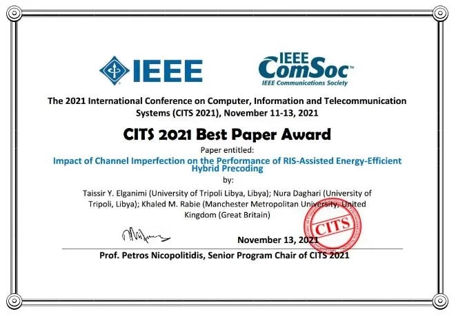 تهنئة خاصة لكل من أ. تيسير الغنيمي (عضو هيئة التدريس بقسم الهندسة الكهربائية) وللمهندسة نورا الدغاري (خريجة قسم الهندسة الكهربائية) لمشاركتهما بورقتين بحثيتين فى مؤتمرين دوليين تابعين لمؤسسة IEEE وحصول احدى الورقات على جائزة افضل ورقة بحثية مشاركة فى المؤتمر CITSالجذير بالذكر ان الابحاث