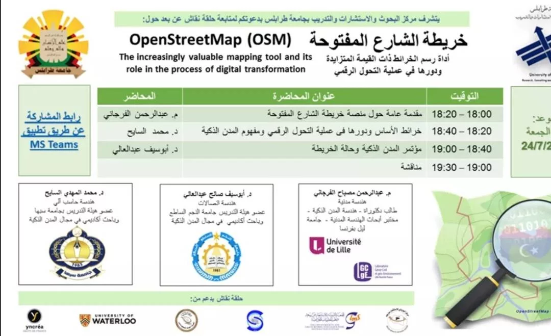 دعوة لحضور حلقة نقاش عن بعد حول خريطة الشارع المفتوحة والمدن الذكيةالسلام عليكم ورحمة الله وبركاتهيتشرف مركز البحوث والاستشارات والتدريب بجامعة طرابلس بدعوتكم لمتابعة حلقة نقاش عن بعد حول:خريطة الشارع المفتوحة: أداة رسم الخرائط ذات القيمة المتزايدة ودورها في عملية التحول الرقميOpenStreetMap (OSM)The