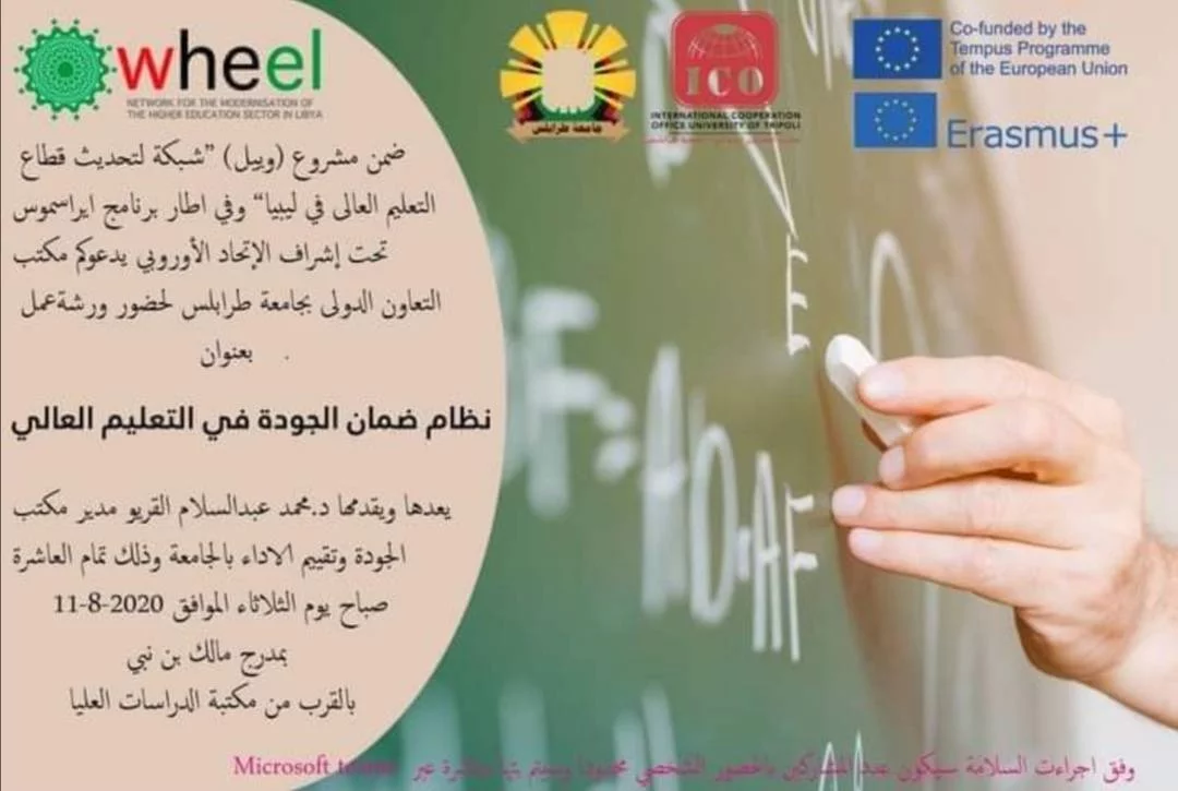ورشة عمل بخصوص نظام الجودة فى التعليم العاليضمن مشروع (Wheel) "شبكة تُعنى بتحديث قطاع التعليم العالى في ليبيا"، وفي إطار برنامج "إيراسموس+" بإشراف الإتحاد الأوروبي، يدعوكم مكتب التعاون الدولى بجامعة طرابلس لحضور ورشة عمل بعنوان [ نظام ضمان الجودة في التعليم العالي ].من إعداد وتقديم "د.محمد القريو