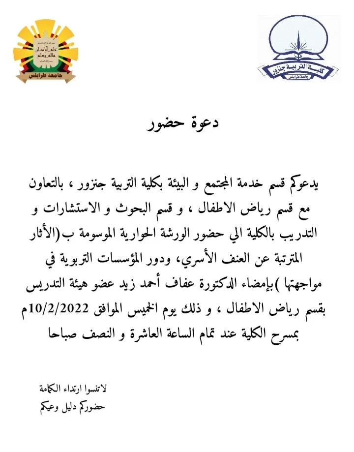دعوة لحضور ورشة حوارية الآثار المترتبة عن العنف الأسري ودور المؤسسات التربوية فى مواجهتهاالمشرف: د عفاف احمد زيدالمكان: مسرح كلية التربية - جنزورالتوقيت: 9:30التاريخ: يوم الخميس 10/2/2022اعداد: - قسم خدمة المجتمع والبيئة - كلية التربية - جنزور- قسم