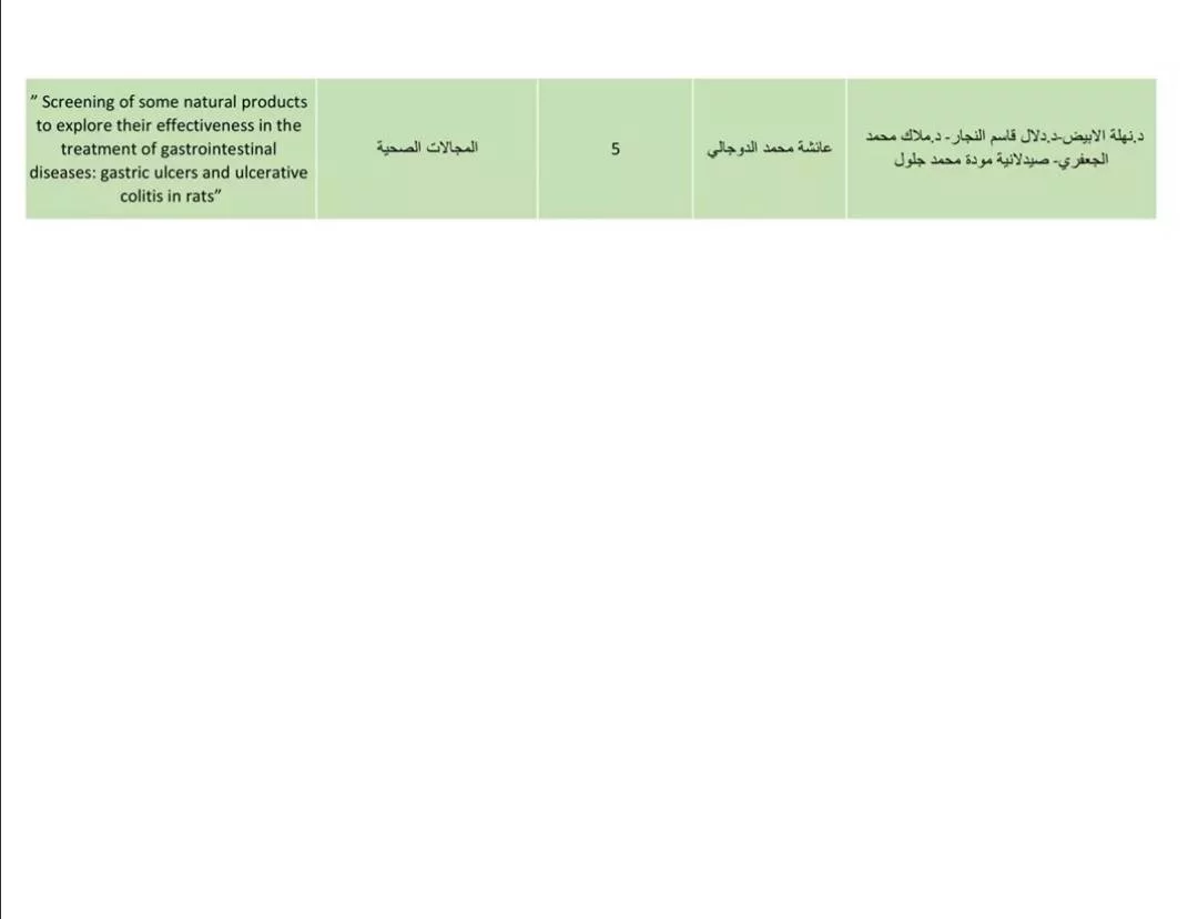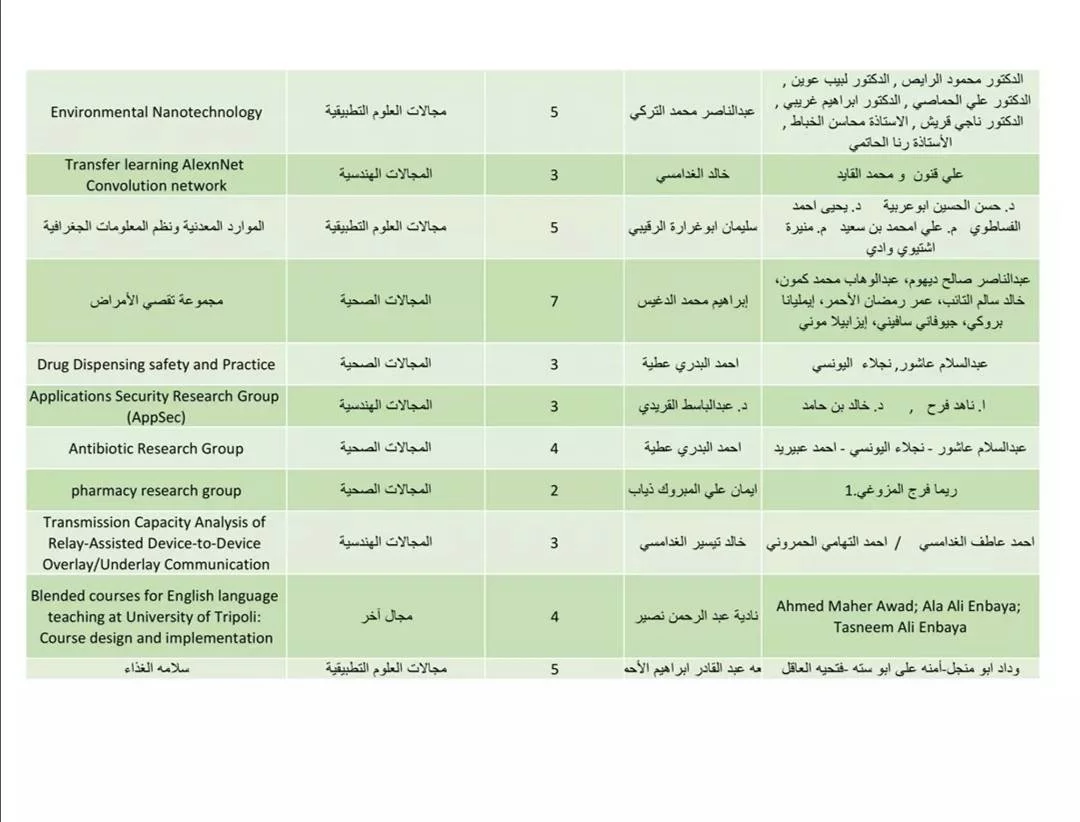 قائمة المجموعات البحثية السلام عليكم ورحمة الله وبركاتهتجدون ادناه قائمة المجموعات البحثية الموجودة فى قاعدة بيانات المركز، يعمل المركز على تفعيل وتشجيع تسجيل المجموعات البحثية بحيث تكون المجموعات البحثية قناة التواصل مع أعضاء هيئة التدريس فى كافة البرامج البحثية والتدريبية المختلفة التى يتم تنفيذها بالجامعة.دعوة لكافة اعضاء هيئة التدريس بالجامعة لتسجيل مجموعات وفرق بحثية خاصة بهم، علما بأن تسجيل المجموعات البحثية يتطلب أن يكون رئيس الفريق عضو هيئة تدريس بالجامعة وان يكون لديه بريد الكترونى رسمى خاص بالجامعة.يمكن الاطلاع على اللائحة التنفيذية الخاصة بالمجموعات البحثية وعلى طريقة تسجيل المجموعات البحثية بالدخول لموقع المركز rcc.uot.edu.lyبالتوفيق لجميع المشاركين