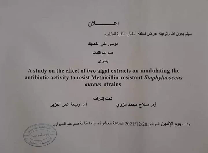 سيتم بعون الله وتوفيقيه عرض حلقة نقاش للطالب / موسى علي الكصيك من قسم علم النبات تحت اشراف أ.د.صلاح محمد الزوي و أ.د. ربيعة عمر الغزير وذلك يوم الاثنين الموافق 20/12/2021 على تمام الساعة العاشرة بقاعة قسم علم الحيوان