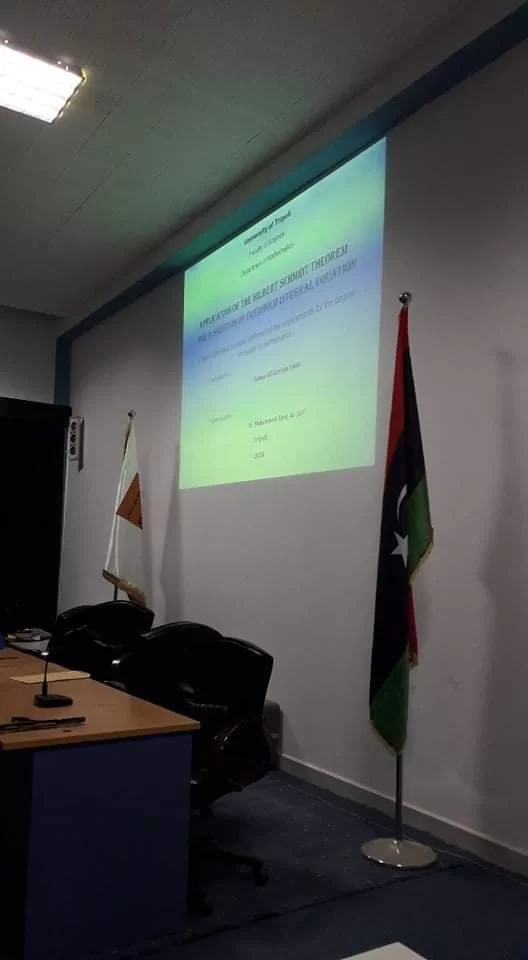 تمت مناقشة رسالة الماجستيراليوم الثلاثاء 7/9/2021 بقاعة قسم علم الحيوان، والمقدمة من طالبة الدراسات العليا بقسم الرياضيات سالمة علي الزوام عامر، والتي بعنوان "تطبيق نظرية هلبرت شميدت لحل معادلة فردهلم التكاملية"، وكانت لجنة المناقشة كالتالي: