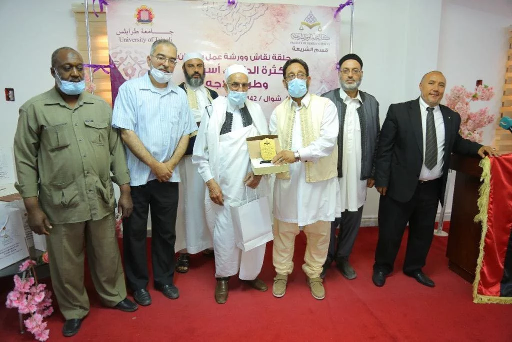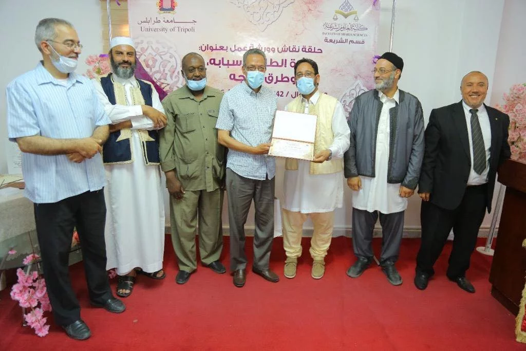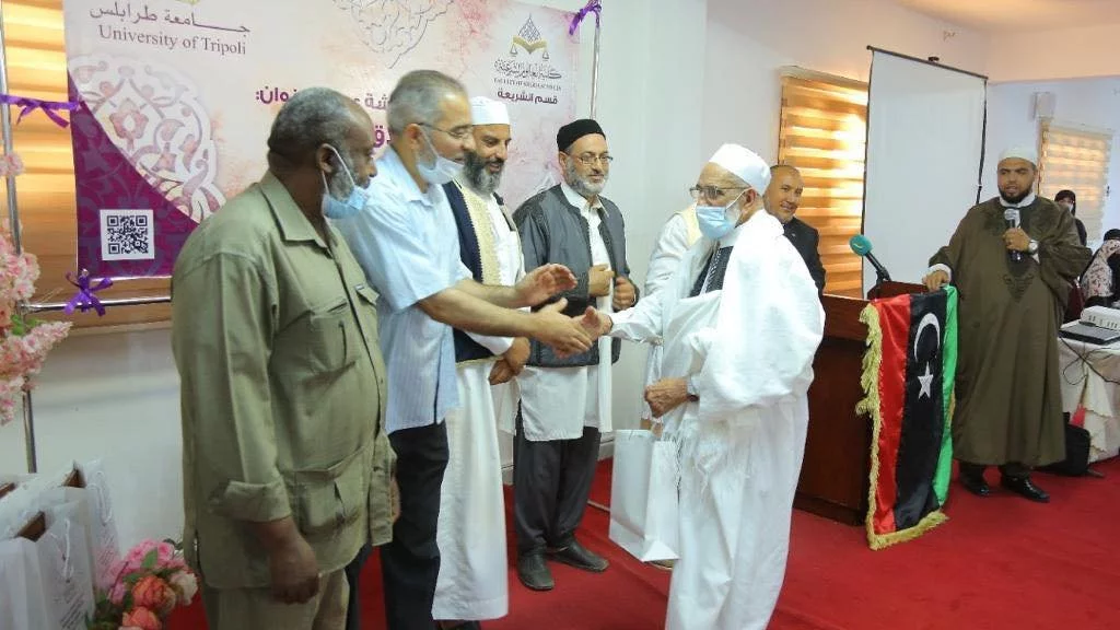 قام قسم الشريعة بكلية العلوم الشرعية بتكريم المشاركين في ورشة العمل وهم : 1- مفتي طرابلس فضيلة الشيخ: أحمد ميلاد قدور.2- الشيخ علي التير مدير مركز الصفا للعلوم القرآنية.3- أ. ناجي الزواوي القاضي بالمحكمة العليا.4- د. أبوبكر أبوسوير عميد كلية جمعية الدعوة الإسلامية.5- أ. طلال الدريبي مدير إدارة مجلس البحوث والدراسات الشرعية بدار الإفتاء.6- د. صالح مصطفى المصراتي الاستشاري في طب الأطفال ، كما تم تكريم طالبات كلية الدعوة الاسلامية المشاركة في ورشة العمل .